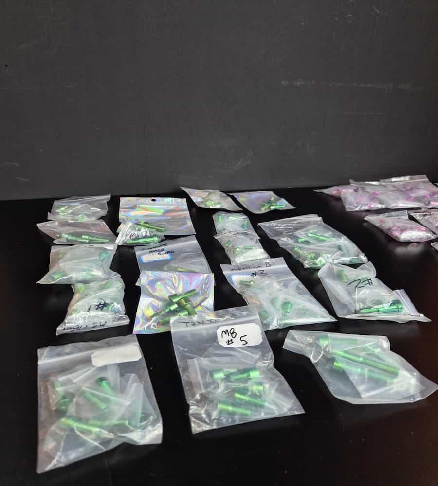 Full set of REAL titanium bolts anodised in green for the entire Sur Ron Light Bee bike replacement, includes more than 200 pieces and covers all bike bolts.